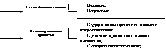 Для удобства рассмотрения классифицируем потребительские ссуды. Классификация может быть проведена по ряду признаков (см. рис.3): по типу заёмщика, видам обеспечения, срокам погашения, методам погашения, целевому направлению использования, объёму и т.д.