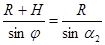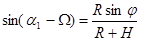 Здесь R - радиус Земли, H - высота воздушного слоя, образующего атмосферу. Угол Ω=α1-α2 есть угол рефракции. Показанный на рисунке световой луч преломляется лишь при входе в слой атмосферы (в точке A). Применяя теорему синусов к треугольнику O1OA, получаем