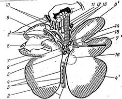1 — пищевод, 2 — аорта, 21 — легочная артерия,-3— дорсальные средостенные лимфатические узлы, 4.41 — диафрагмальные левые и правые доли легкого, 5 — средний бронхиальный лимфатический узел, 6 — левый бронхиальный лимфатический узел, 7,11 — сердечные левая и правая доли легкого, 8.81 —верхушечные доли левого и правого легкого, 9 — сердце, 10 — полые вены, левая подключичная и правая плечеголовная артерий, 11 — краниальный средостенный лимфатический узел, 12 — трахея, 13 — надартериальный лимфатический узел и трахейный добавочный бронх, 14 — правый бронхиальный лимфатический узел, 15 — средний средостенный лимфатический узел, 16 — добавочная доля легкого (снизу).