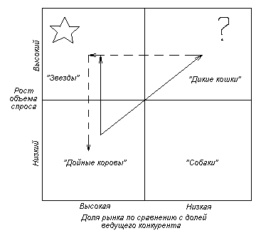 бак».Матрица БКГ помогает выполнению двух функций: принятию решений о намеченных позициях на рынке и распределению стратегических средств между различными зонами хозяйствования в будущем.