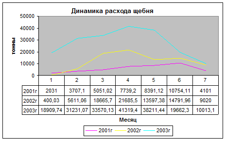 Динамику расхода щебня в период с 2001-2003 года отобразим графически :