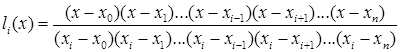 Необходимо, чтобы каждый многочлен li(x) обращался в нуль во всех узлах интерполяции, за исключением i-го, в котором он равен 1 (Рис. 12). Если li(x) удовлетворяет таким условиям, то в i-ом узле интерполяции многочлен Ln(x) примет значение yi, что