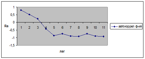Коррелограмма представляет собой затухающую функцию. По графику видно, что наиболее высоким оказался ra1=0,809, т.е. уровни текущего года на 80,9% обусловлены уровнями предыдущего года. Поэтому ряд содержит только тенденцию и не содержит периодических колебаний. В данном ряду отсутствует трендовая компонента Т и циклическая (сезонная) компонента S.