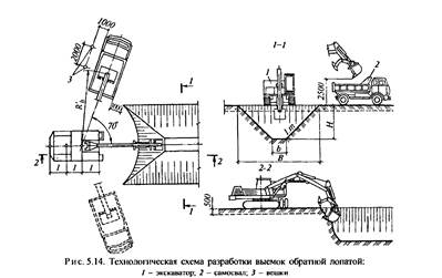 Разработку грунта экскаватором «обратная лопата» производят боковым и лобовым забоями с погрузкой грунта в транспорт или в отвал (рис. 5.14). При боковом забое экскаватор разрабатывает выемки сбоку, ширина выемки ограничена радиусом резания, разработка грунта осуществляется поперек гусеничной ленты, т. е. при наименее устойчивом положении экскаватора. При лобовом забое черпание грунта производят при постепенном движении экскаватора задним ходом, разгрузку выполняют в транспортные средства, которые подаются к экскаватору по дну забоя или сбоку по естественной поверхности земли. Ширина забоя ограничивается только требованием нормальной производительности механизма. При лобовом забое экскаватор опускает стрелу с рукоятью в самое нижнее положение между гусеницами, поэтому глубина разработки узких траншей больше, чем широких.