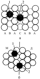 Рис. 2. Двумерные модели присоединения атома к граням ГПУ-решетки (10.0) (а) и (00.1) (б) в нормальное положение (1) и в месте выхода ДУ, положение (2) (а) и границы двойника, положение 2 (б). Грани (10.0) и (00.1) параллельны рисунку.