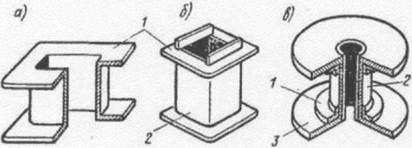 Рис. 17-1. Каркасы катушек: а - прессованные; б - сборные; в - клееные; 1 - щека; 2 - гильза; 3 – шайба