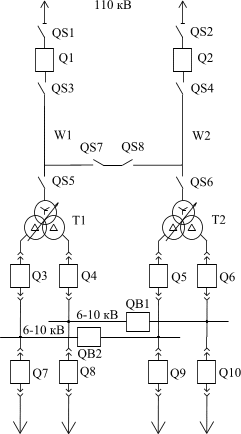 Рис. 7. Однолинейные схемы электрических соединений главных понизительных подстанций с двумя трансформаторами: а) - без выключателей на стороне высшего напряжения; б) - с выключателями.