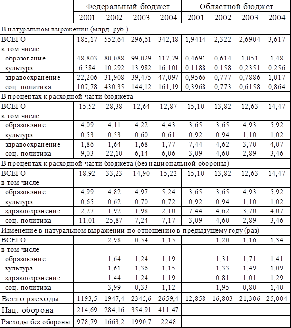 Таблица 6. Тенденции финансирования основных направления социальной сферы на федеральном и областном уровне в 2001-2004 гг.