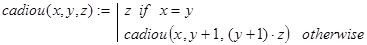 Решение. При y=0 и z=1 имеем z=y!. Далее из характера декомпозиции функции cadiou() ясно, что z=y! остается инвариантом в ходе рекурсивных вызовов. Вместе с условием завершения x=y это и дает z=x! и (7) установлено.