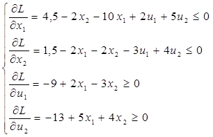=-5x12-x22-2x1x2+4.5x1+1.5x2+u1(2x1-3x2-9)+u2(5x1+4x2-13)