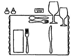 Обычно первое блюдо ставят на стол до того, как гости заняли свои места. В противном случае обеденная салфетка лежит на мелкой тарелке, а не слева от вилок, как показано на рисунке. Рыбную вилку можно разместить тремя способами