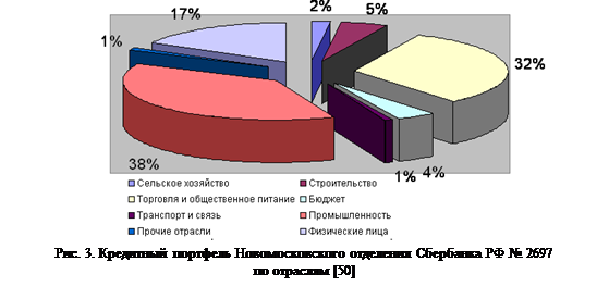 В структуре кредитного портфеля преобладают кредиты корпоративным клиентам – 83 процента предоставленных кредитов, из них 38 процента - это кредиты предприятиям промышленности, 32 процента - предприятиям торговли и общественного питания. На рис. 3 представлена отраслевая структура кредитного портфеля Новомосковского отделения Сбербанка РФ № 2697.