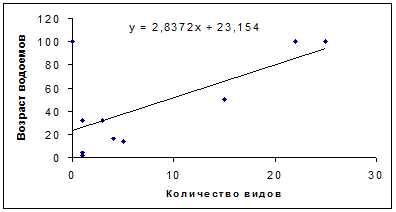 Для определения зависимости между числом видов моллюсков и возрастом водоема использовали следующий прием. Поскольку возраст рек установить невозможно, мы приняли их условный возраст за 100 лет. Возраст всех остальных водоемов нам известен. Расчет показал, чт