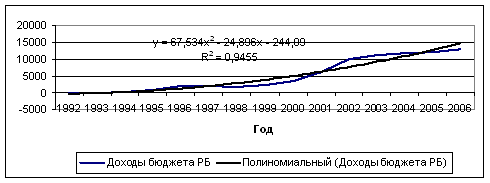 Анализируя графики динамики дохода бюджета РБ и их различные тренды, можно сделать вывод, что изменения дохода наиболее четко описывает полиномиальный тренд шестого порядка, при этом наблюдается наибольшая величина достоверности аппроксимации – 0,9941.
