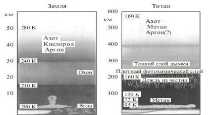 Строение Титана: каменистое ядро , покрытое толстым слоем льда, типично для холодных тел Солнечной системы. Лед, как предполагают, метановый (СН4), также с примесями аммиака (NH 3). Ультрафиолет разрушает молекулу аммиака, высвобождая водород, который испаряется в открытый космос, а в атмосфере остается азот в газообразном состоянии(N2), основная часть нашего воздуха.