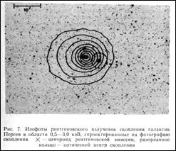 Не менее интересные данные получены для скопления галактик в Персее в рентгеновской области спектра. Открытие рентгеновского излучения в Персее было сделано на ракете "Аэробе", запущенной 1 марта 1970 г. Наблюдения велись в четырех интервалах энергии: 0,5 – 1,0, 1,0 – 1,5, 1,5 – 2,5 и 2,5 – 10 кэВ. Вновь открытый рентгеновский источник получил название Персей Х-1. Затем наблюдения этого источника были проведены на спутнике УХУРУ и на ракетах.