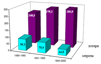 Необходимо отметить, что ежегодные расходы на организацию и ведение лесного хозяйства уменьшаются при одновременном возрастании потерь по отрасли (рис. 1.4.), а последние десять лет ежегодные затраты на лесное хозяйство (в долларовом исчислении) снизились в 1,9 раза, потери же за этот период возросли в 1,2 раза. Значительно изменилась и разница между ними. Если в 1986–90 гг. потери превышали затраты в 2,8 раза, то в уже 1997 г. урон превысил расходы на лесное хозяйство в 6,4 раза.