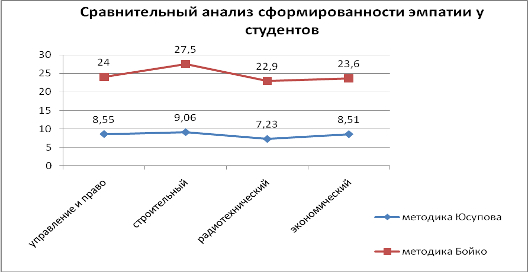 Мы видим, что графики на рис.13 показывают разную степень выраженности эмпатии у студентов различных специальностей. По результатам методики Юсупова и методики Бойко, у студентов строительного факультета эмпатия более выражена, а студенты радиотехнического факультета обладают наименее выраженными эмпатическими способностями.