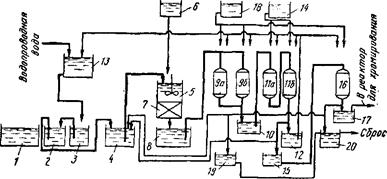 Сточные воды из резервуара 16 подают для нейтрализации в резервуар 5, куда из резервуара подают водный раствор гидроксида натрия до получения приблизительно нейтральной реакции (рН = 7-9). При этом происходит осаждение железа, меди и других металлов в виде гидроксидов. Смесь проходит через фильтр 7, расположенный под резервуаром 5; фильтрат направляют в резервуар 8. В результате такой обработки в сточных водах процесса хромирования происходит замена ионов металлов на ионы натрия. Реакция раствора в резервуаре 8 близка к нейтральной (рН = 7-4-8). Этот раствор направляют для предварительной обработки в башни 9а и 96, заполненные катионообменной смолой, где происходит удаление ионов натрия в результате адсорбции. В результате очистки получают разбавленный раствор двухромовой кислоты, который временно хранится в резервуаре 10.