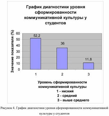 Полученные данные также совпали с показателями предыдущих методик.52,2% имеют низкий уровень (0,1-0,45) коммуникативной культуры или ниже среднего (0,46-0,55). Средний уровень (0,56-0,65) имеют 36% исследуемых. Выше среднего (0,65-0,75) имеют 11,8% студентов. Высокого уровня развития коммуникативной культуры не имеет ни один студент (рис.4). Таким образом, после начальных срезов были выделены следующие проблемы: