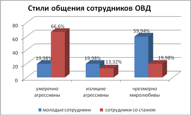 На рисунке 3 показано отличие стилей общения молодых сотрудников ОВД и сотрудников со стажем. Мы видим, что для большинства сотрудников со стажем характерна умеренная агрессивность, а большинство молодых сотрудников отличаются чрезмерной миролюбивостью и неуверенностью в своих возможностях.