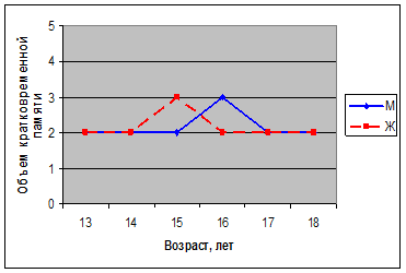 Для анализа объема кратковременной памяти у школьников в зависимости не только от пола, но и от возраста, данные представлены в виде графика (рис. 7). Для построения данного графика были использованы моды. (Мода – варианта с наибольшей частотой).