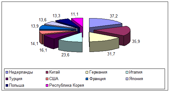 Основными торговыми партнерами России в январе-августе 2010 года среди стран дальнего зарубежья были: Нидерланды, товарооборот с которыми составил 37,2 млрд.долларов США (155,1% к январю-августу 2009 года), Китай – 35,9 млрд.долл.США (157,1%), Германия – 31,7 млрд.долл.США (134,7%), Италия – 23,6 млрд.долл.США (120,7%), Турция – 16,1 млрд.долл.США (134,5%), США – 14,1 млрд.долл.США (133,4%), Франция – 13,9 млрд.долл.США (140,6%), Япония – 13,6 млрд.долл.США (153,4%), Польша – 13,3 млрд.долл.США (138,4%), Республика Корея – 11,1 млрд.долл.США (182,2%).