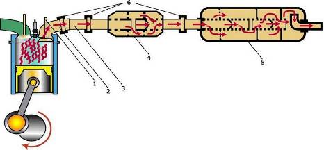 1 - выпускной клапан; 2 - выпускной трубопровод; 3 - приемная труба глушителя; 4 - дополнительный глушитель (резонатор); 5 - основной глушитель; 6 - соединительные хомуты