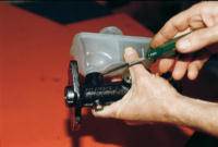 Ключом "на 10" отворачиваем четыре штуцера тормозных трубок и выводим трубки из корпуса регулятора. Для предотвращения утечки жидкости из гидропривода на концы трубок надеваем защитные колпачки прокачных штуцеров колесных цилиндров. |