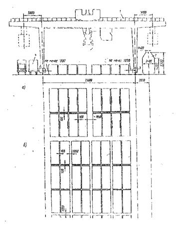 Рисунок 2. схема размещения контейнеров на ППК с расположением в пролете крана: а и б – автопоездов; в – железнодорожных путей; г – железнодорожных путей и автопоездов.
