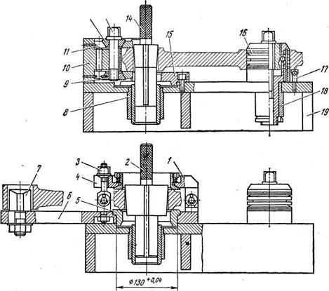 Рис 6. Приспособление для расточки отверстий в головке шатуна: 1 - прижим; 2, 14 - съемные пальцы; 3 - накидная гайка; 4 - планка; 5, 15 - установочные втулки; 6, 10 - съемные приставки; 7 - палец срезанный; 8, 18 - направляющие втулки; 9, 12 - конусные шайбы; 11 - при хват; 13 - болт; 16 - установочный палец; 17 - упор; 19 - корпус.