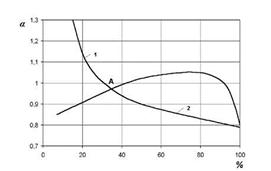 Рисунок 1.8 – Изменение коэффициента избытка воздуха от количества смеси, поступающей в двигатель: 1 – характеристика простейшего карбюратора; 2 – требуемая характеристика.