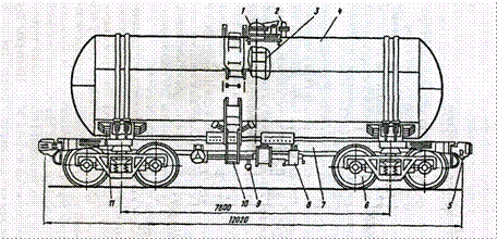 Конструктивно цистерна состоит из следующих основных частей (рис.1): рамы 7, ходовой части 6, ударнотяговых устройств 5, тормозного оборудования 8, котла 4, внутренней 3 и наружной 10 лестниц, устройств крепления котла к раме 11, горловины 1 и сливного прибора 9, предохранительной арматуры 2.