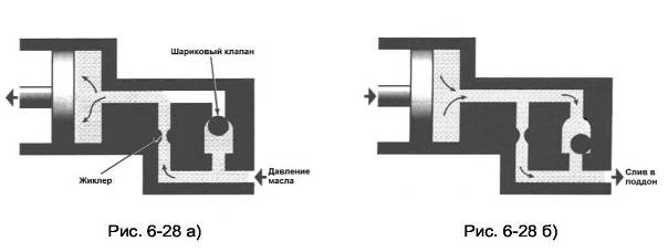 В одном канале устанавливается жиклёр, а во втором шариковый клапан одностороннего действия. Во время включения фрикционного элемента давление жидкости, подводимой из основной магистрали, прижимает шарик к седлу клапана (рис.6-28а). В результате жидкость попадает в гидропривод только через жиклёр, и формирование давления происходит по заданному закону. В случае выключения фрикционного элемента гидропривод соединяется со сливной магистралью, поэтому давление отжимает шарик клапана одностороннего действия (рис.6-28б), и жидкость вытекает по двум каналам, что значительно увеличивает скорость его опорожнения.