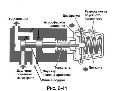 Во многих АКПП с чисто гидравлической системой управления для управления клапаном-дросселем используется модулятор. Модулятор представляет собой камеру, разделенную с помощью металлической или резиновой диафрагмы на две части (рис.6-41).