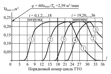На рисунке 4.6 приведена графическая интерпретация процесса формирования производительности перегружателя на выходе последней ячейки. Рассмотрим 4 варианта перегружателей: