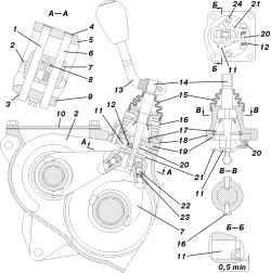 Рис. 204. Механизм переключения раздаточной коробки: 1 – шток вилки включения прямой и понижающей передач; 2 – вилка включения прямой и понижающей передач; 3 – стопорная пластина штоков; 4 – заглушка; 5 – каpтеp раздаточной коробки; 6 – шток вилки включения переднего моста; 7 – вилка включения переднего моста; 8 – штифт; 9 – кpышка каpтеpа; 10 – крышка люка; 11 – стойка фиксатора; 12 – пружина фиксатора; 13 – рычаг переключения; 14 – рычаг вилок включения; 15 – защитный чехол; 16 – штифт; 17 – пружина рычага; 18 – корпус рычага; 19 – пластина крепления фиксатора; 20 – ось фиксатора; 21 – фиксатор; 22 – шарик-фиксатор; 23 – пружина шарика-фиксатора; 24 – винт