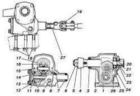 Рис. 253. Рулевой механизм типа червяк-ролик: 1 – картер; 2, 27 – втулки; 3 – манжета; 4 – сошка; 5 – шайба; 6 – гайки; 7 – сальники; 8,14 – подшипники; 9 – пробка; 10 – вал рулевого механизма; 11 – червяк; 12 – нижняя крышка; 13 – регулировочные прокладки; 15 – ось ролика; 16 – ролик вала сошки; 17 – вал сошки; 18 – болты крепления картера; 19 – шарнир; 20 – регулировочный винт; 21 – колпачковая гайка; 22 – стопорная шайба; 23 – штифт; 24 – подшипник; 25 – боковая крышка картера; 26 – прокладка