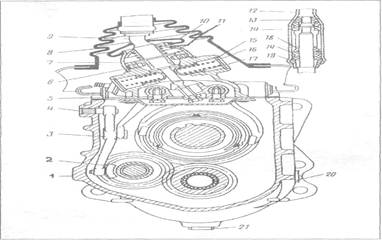 Рис. 108. Механизм переключения передач и поперечный разрез коробки передач: 1 - картер; 2 -сухарь; 3 - рычаг; 4 - ось рычага; 5 - стопорный болт 6 -штифту 7 - колпак; 8 уплотнитель пола; 9 - нижняя часть рычага переключения передач; 10 - защитный уплотнитель коробки передач; 11 - седло пружины; 12 - верхняя часть рычага переключения передач; 13 - пластмассовый упорный конус; 14 - резиновые подушки; 15 - заглушки; 16 -пружина; 17 - предохранитель; 18 - пластмассовая распорная втулка; 19 -пластмассовая запорная втулка; 20 - пробка маслоналивного отверстия; 21 - пробка маслосливного отверстия
