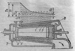 Рис. 7. Реактивная турбина с шестью ступенями давления и диаграмма изменения скоростей и давлений по длине проточной части.