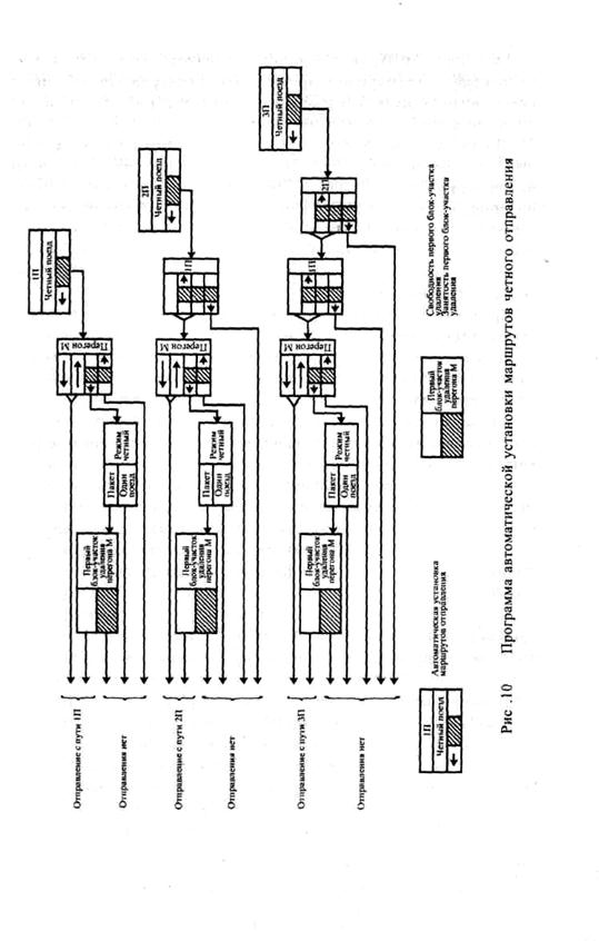 Если перегон Р занят поездом встречного направления и все пути свободны, маршрут приема автоматически устанавливается на боковой путь 3П, а если он занят поездом встречного направления при свободных двух других путях, - на главный путь 1П. Если же путь 3П занят поездом попутного направления или "поездом без направления", в случае свободности двух других путей маршрут приема автоматически устанавливается на второй боковой путь 2П. Если путь 2П занят поездом встречного направления, а пути 1П и 3П свободны, маршрут приема будет автоматически задаваться на главный путь 1П. Этот же маршрут будет устанавливаться, если пути 2П и 3П будут заняты поездами встречного направления.