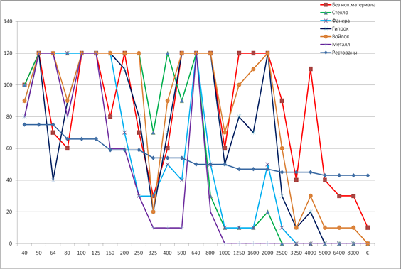 Вывод: по данным испытаний можно сделать вывод, что уровень звука ниже нормы для всех испытуемых материалов. Но, исходя из анализа графика видно, что наиболее лучшие шумозащитные характеристики имеет образец метал. Но так как для данного помещения не рационально использовать данный материал, то исх