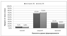Из диаграммы видно, что в экспериментальном классе высокая сформированность внимания – у 22,2% (5 чел.), средняя – у 65,6% (16 чел.), низкая– у 14,2% (3 чел.). В контрольном классе высокая – у 25,4% (6 чел.), средняя – у 60,4% (16 чел.), – у 15,2% (4 чел.). Таким образом, можно сделать вывод, что уровень сформированность внимания и самоконтроля экспериментального класса выше.