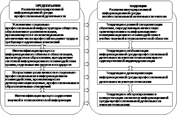 В процессе анализа тенденций развития информационной среды профессиональной деятельности учителя в условиях интеграции науки, производства и образования установлено, что в силу ярко выраженной связи с различными областями жизнедеятельности, образование как социальный институт характеризуется принципиальным сходством тенденций своего развития с тенденциями развития общества. Наиболее важной из них следует признать тенденцию к профессионализации или специализации социально-профессиональной деятельности. Связанная с этим ранняя специализация обучения является отражением более масштабной, общесоциальной тенденцией к расширению и усложнению социально-профессиональной инфраструктуры общества.
