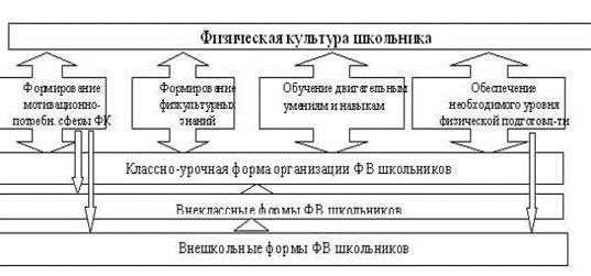 На наш взгляд, на современном этапе классно-урочная форма ФВ должна сосредоточиться преимущественно на решении образовательного блока задач ФВ школьников: на формировании системы физкультурных знаний и обучении двигательным, гигиеническим, методическим умениям и навыкам. В то время как задача по формированию необходимого уровня физической подготовки и частично задача формирования мотивационно-потребностной сферы ФК должны решаться преимущественно через внеклассные формы ФВ. Роль внешкольных форм ФВ должна быть приближена к внеклассным. Однако они одновременно должны обеспечить формирование спортивного и рекреационного компонентов индивидуальной ФК школьника. В целом школьно-урочная форма должна обеспечить формирование базового компонента ФК, а внеклассная и внешкольная - индивидуально-вариационного (Рис.4).