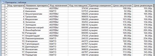 В базе данных аптеки на каждую группу препаратов (антибиотики, антисептики и т.п.) приходится небольшое количество лекарственных средств, которые находятся на складе аптеки.