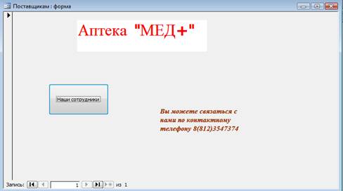 Главная кнопочная форма "Аптека "Мед+" содержит две кнопки: "Препараты в наличии" и "Наши сотрудники". Нажатием на эти кнопки автоматически переходим на две предыдущие формы.