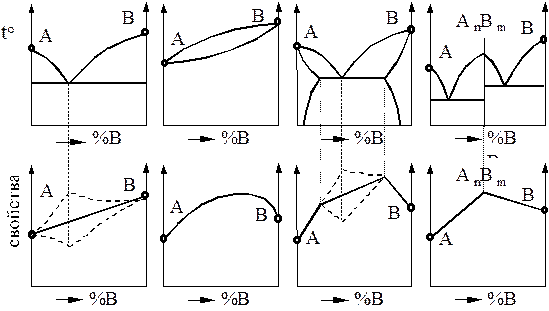 На рис. 5.6 изображены диаграммы "состав-свойства" в зависимости от вида диаграмм состояния (по Н.С. Курнакову).