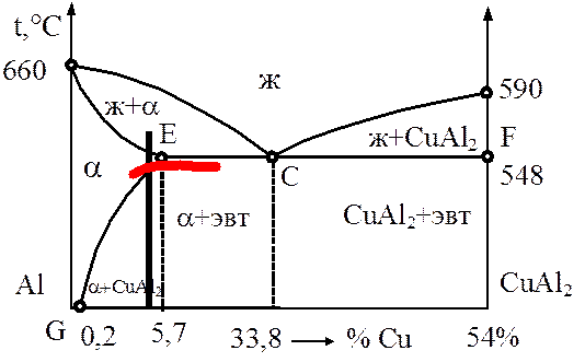 Рис. 10.1. Диаграмма состояния Al - Сu(СuАl2) и интервал закалочных температур