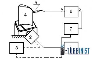 С генератора 1 напряжение переменной частоты подаётся на вибровозбудитель 2 (при необходимости использования вибровозбудителя большой мощности используется усилитель мощности 3). Возбуждаемые колебания детали 4 воспринимаются пьезодатчи